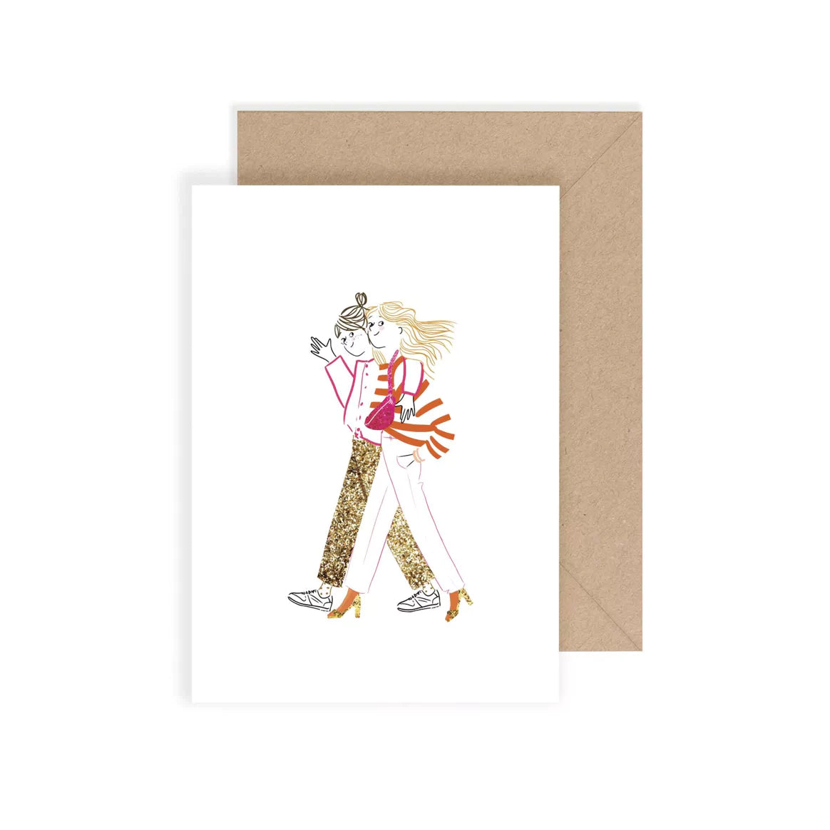 Jolie carte postale Les deux joyeuses copines vous saluent ! Bras dessus bras dessous, elles se promènent, cheveux au vent.... En savoir plus